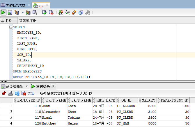 用法說明: 關鍵詞(keyword): IN IN 在那些值裡 IN(1,2,3,4,9,11,12) 例: 此用 EMPLOYEES 資料表 來說明 查出 EMPLOYEE_ID 有110,115,117,120的資料