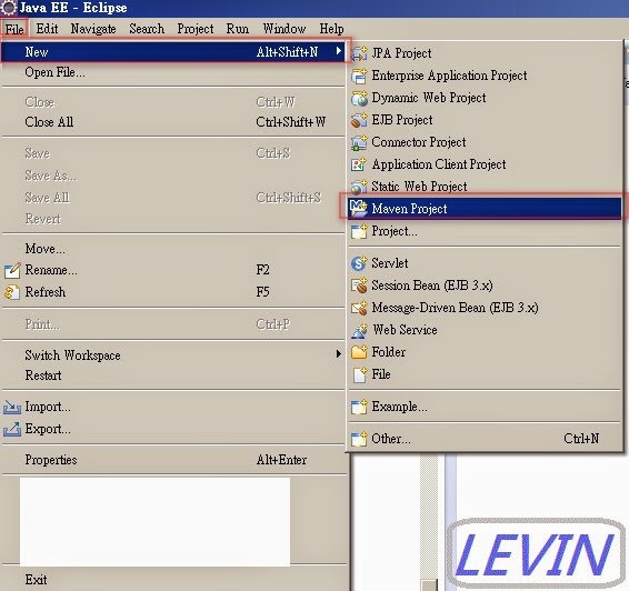 圖1 開啟Eclipse -> File -> New -> Maven Project