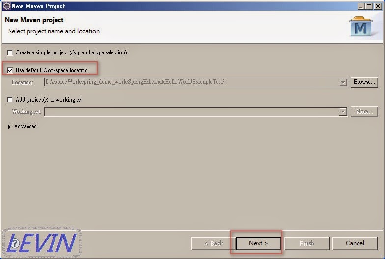 圖2 選擇專案存放位置 use default Workspase location-> Next