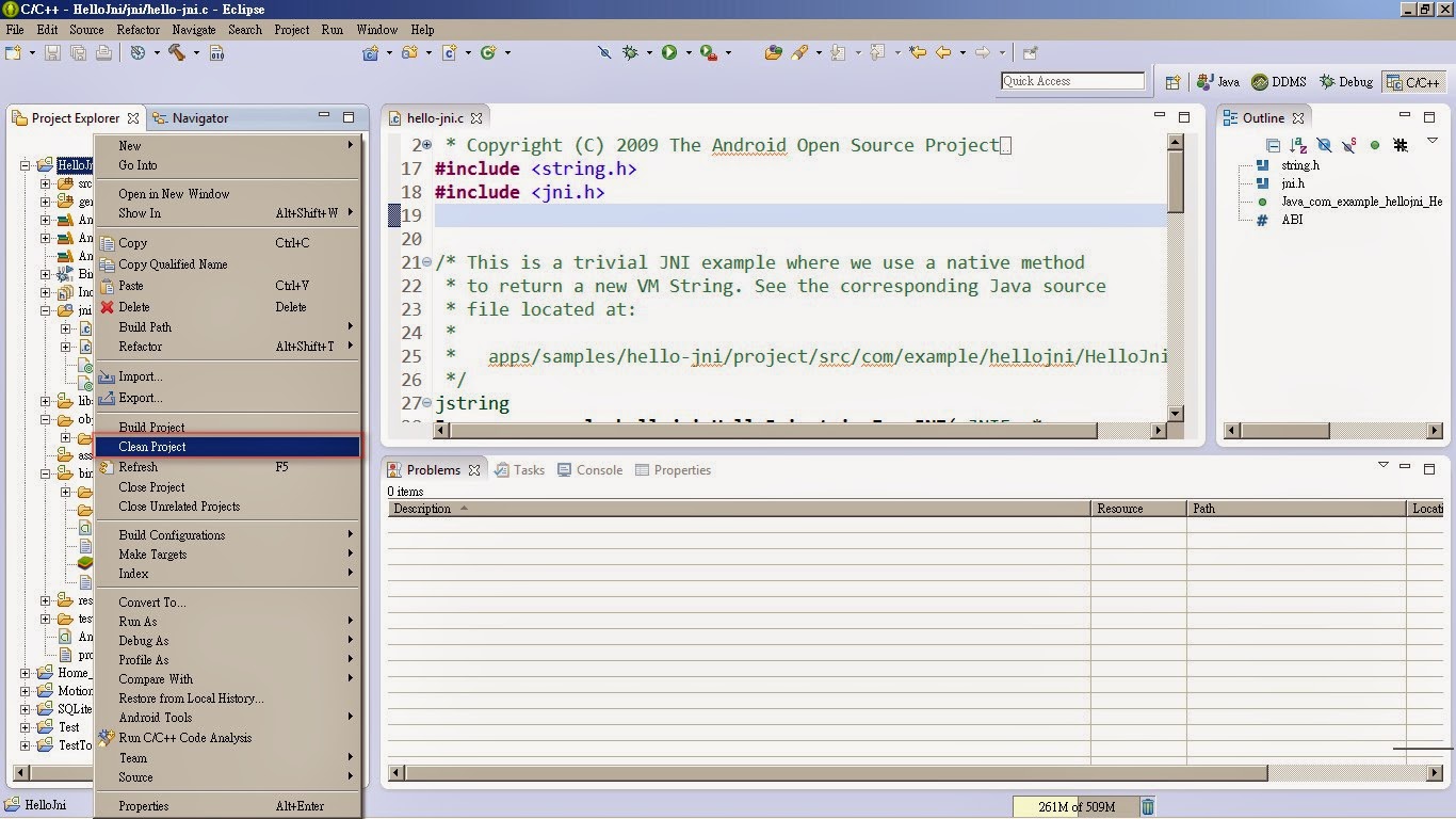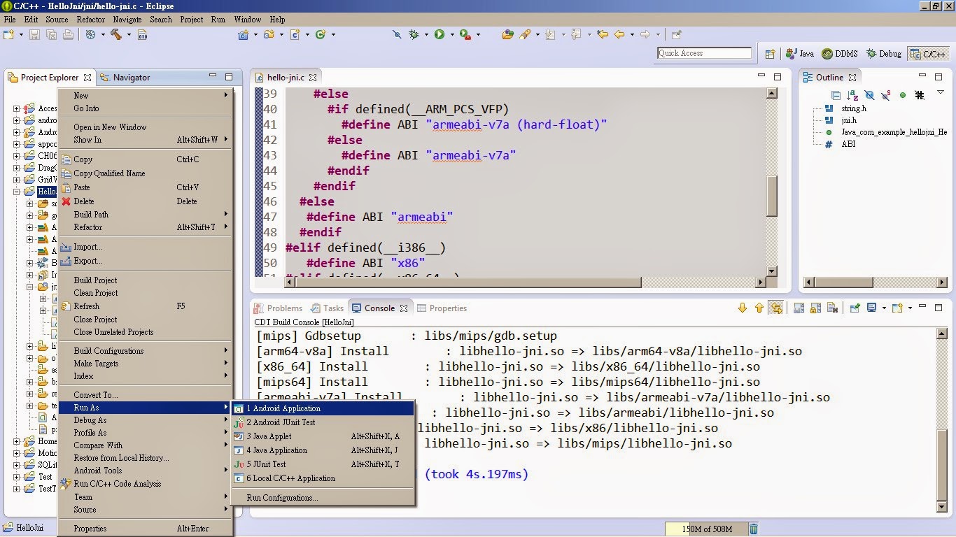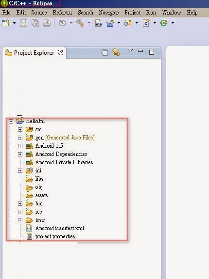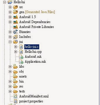 圖12 進入jni資料,找到 hello-jni.c 如果有Method NewStringUTF could not be resolved 錯誤 請到最後看下一篇來解決問題