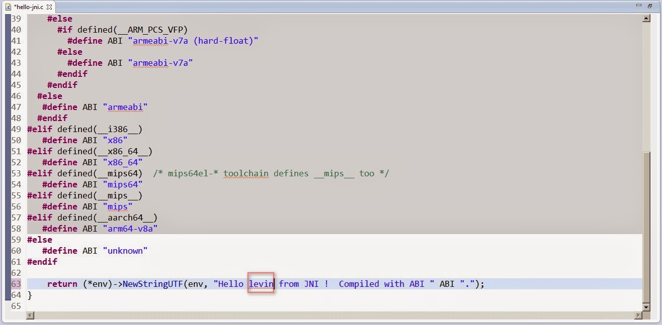 圖15 進入hello-jni.c 在最後有Hello from JNI ! ..... 本例改為 Hello levin from JNI ! .....