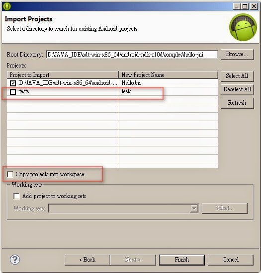 例: NDK目錄為:D:\JAVA_IDE\adt-win-x86_64\android-ndk-r10d\ 如下: D:\JAVA_IDE\adt-win-x86_64\android-ndk-r10d\samples\hello-jni 確認 圖4 Import Projects 介面 -> 取消tests資料