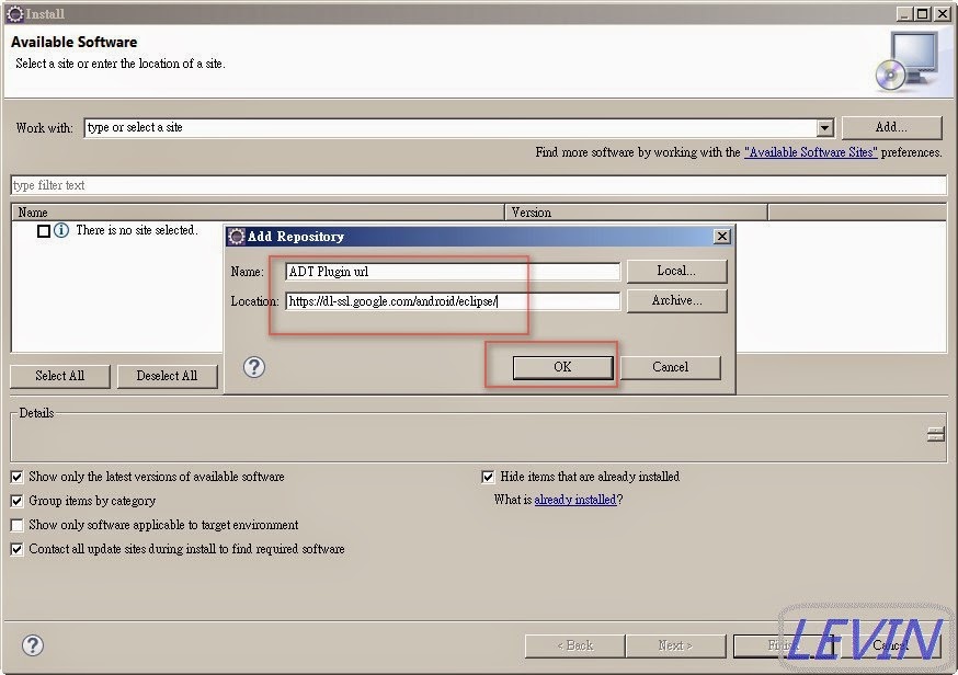 二、ADT Plugin url 圖2 ADT Plugin url https://dl-ssl.google.com/android/eclipse/ 與第三項,二種選一種