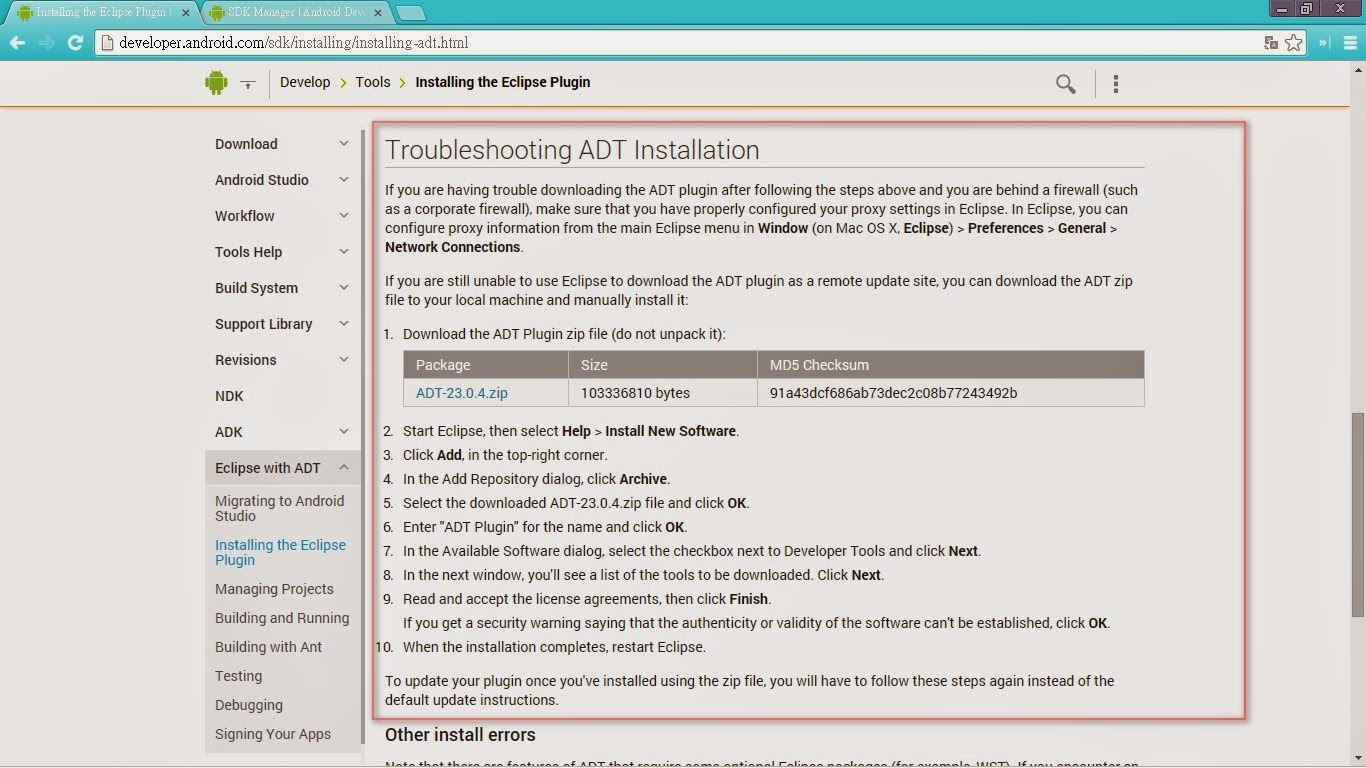 Android Eclipse 之 ADT 下載與安裝(三) 上一篇: Android Eclipse 之 SDK 下載與安裝(二) 一、進入 ADT Eclipse Plugin Installing the Eclipse Plugin 圖1