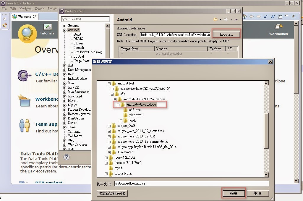 十四、 是否要重啟 -> Yes. 十五、重啟後 Window -> Preferences -> Android -> Browse.. 圖15