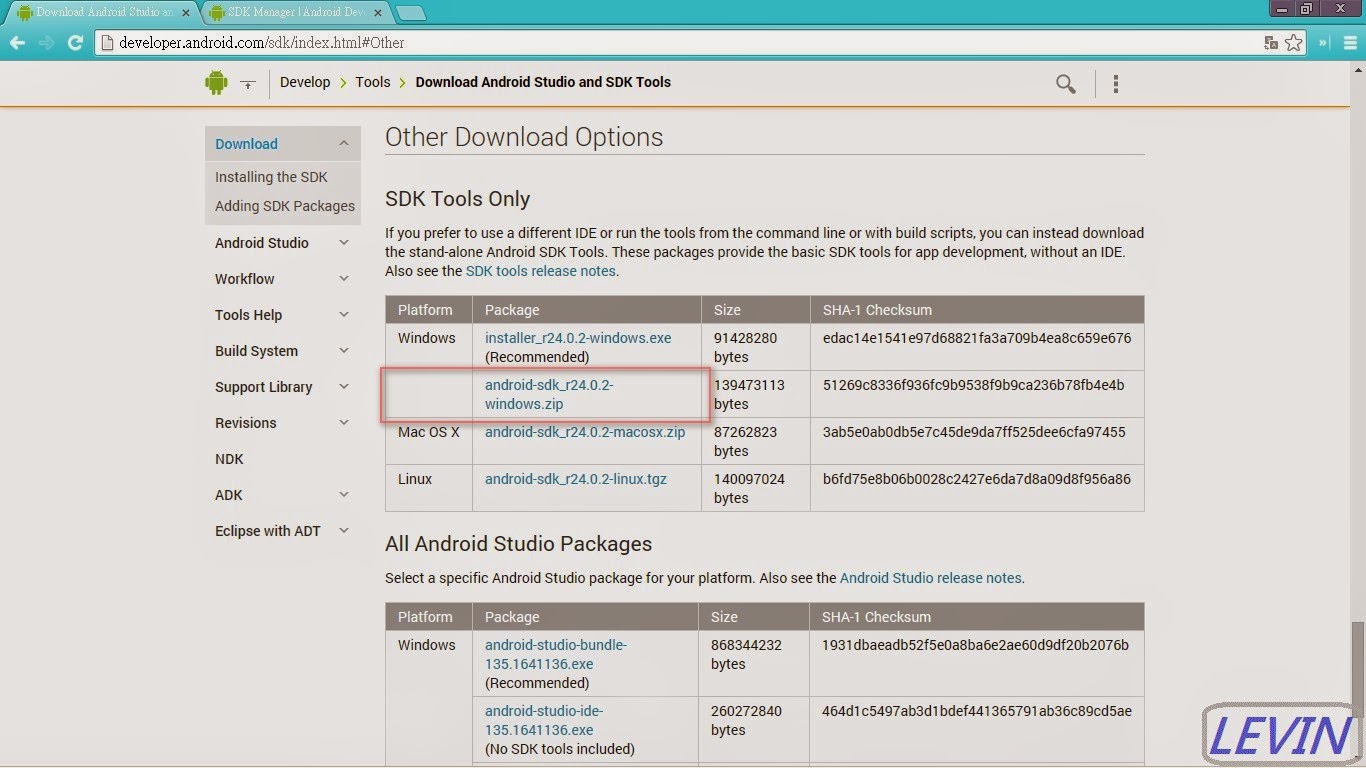 三、進入Android SDK Tools 下載頁選擇版本頁 圖3 本例選擇:android-sdk_r24.0.2-windows.zip 請依你的作業系統支援的版本