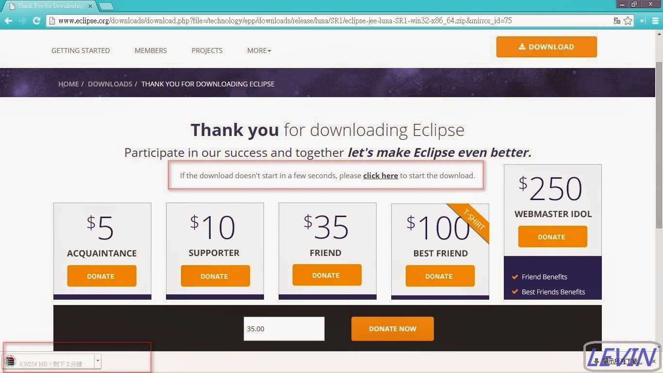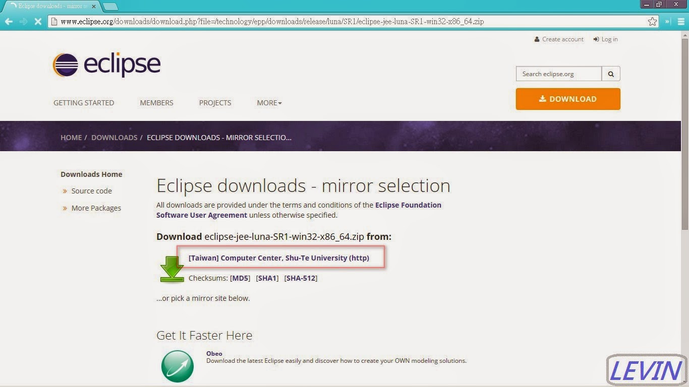 三、進入下載頁 圖2 按下下載(圖中紅框) 本例下載檔為:eclipse-jee-luna-SR1-win32-x86_64.zip