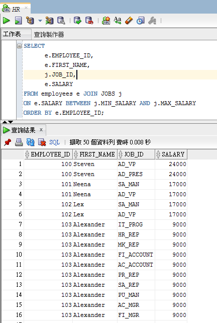 Oracle SQL nonequal join 不對等join 使用工具sqldeveloper 請先參考 sqldeveloper下載及安裝及連線 測試資料來源請先參考 Oracle DB 目錄