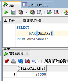 Oracle SQL MAX 用法教學 使用工具sqldeveloper 請先參考 sqldeveloper下載及安裝及連線 測試資料來源請先參考 Oracle DB 目錄 關鍵詞(keyword):MAX() MAX(欄位) 求最大值 例: 使用employees SELECT MAX(SALARY) FROM employees; 測試: 相關Oracle SQL用法教學 其它文章 首頁JAVA 目錄JAVA WEB 目錄JAVA 其他未分類 目錄Grails目錄jQuery 目錄Apache 目錄JavaScript 目錄Spring + Hibernate 目錄Hibernate 目錄Linux 目錄程式開發工具目錄MySQL 目錄PHP目錄C/C++ 目錄Google App Engine 目錄HTML5/CSS3程式開發基本資訊Android Oracle 目錄Struts 目錄