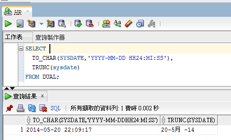 用法說明: 關鍵詞(keyword): TRUNC 對日期作無條件捨去運算 TRUNC(date) 日期 無條件捨去 TRUNC(date,'年/月') MONTH 月 無條件捨去 YEAR 年 無條件捨去 例: 此用 DUAL 表 2014年5月20日 月 無條件捨去