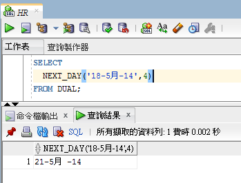 例: 此用 DUAL 表 跟 2014/05/18 星期日 下一個星期三的日期為2014/05/21 星期三