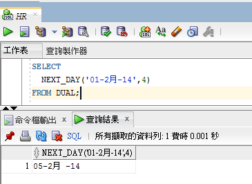 例: 此用 DUAL 表 跟 2014/05/19 星期一 下一個星期三的日期為2014/05/21 星期三