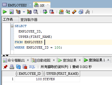 用法說明: 關鍵詞(keyword):UPPER UPPER 轉大寫 例: 此用 EMPLOYEES 資料表 來說明 EMPLOYEE_ID為100的資料 的FIRST_NAME 用大寫來顯示