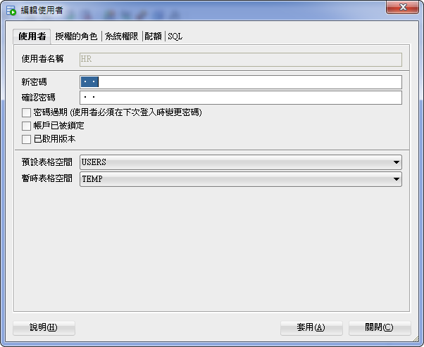 [Oracle DB]綀習 Oracle Database Ex(Express Edition)連線測試及sqldeveloper工具開啟綀習的使用者帳號連線及基本測試 上一篇Oracle DB教學[Oracle DB]綀習 Oracle Database Ex(Express Edition)連線測試及sqldeveloper工具建立連線登入SYSTEM後->按下其他使用者->HR 在HR鶗下右鍵->編輯使用者 輸入密碼及取銷密碼過期及帳戶己被鎖定 這裡輸入密碼為 HR 將角色授權->設全部 (因為給初學者練習用的,在進階的時後再來了解)->套用 確定 下一篇Oracle DB教學[Oracle DB]綀習 Oracle Database Ex(Express Edition)連線測試及sqldeveloper工具開啟綀習的使用者帳號連線及基本測試 看Oracle DB相關 其它文章 首頁JAVA 目錄JAVA WEB 目錄JAVA 其他未分類 目錄Grails目錄jQuery 目錄Apache 目錄JavaScript 目錄Spring + Hibernate 目錄Hibernate 目錄Linux 目錄程式開發工具目錄MySQL 目錄PHP目錄C/C++ 目錄Google App Engine 目錄HTML5/CSS3程式開發基本資訊Android Oracle 目錄Struts 目錄