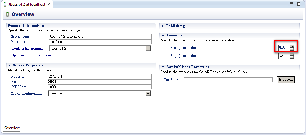 Eclipse啟動JBoss 執行錯誤(timeout) Eclipse中啟動JBoss v4.2 錯誤提示: Starting JBoss v4.2 at localhost has encountered a problem Server JBoss v5.0 at localhost was unable to start within 50 seconds. If the server requires more time, try increasing the timeout in the server editor.