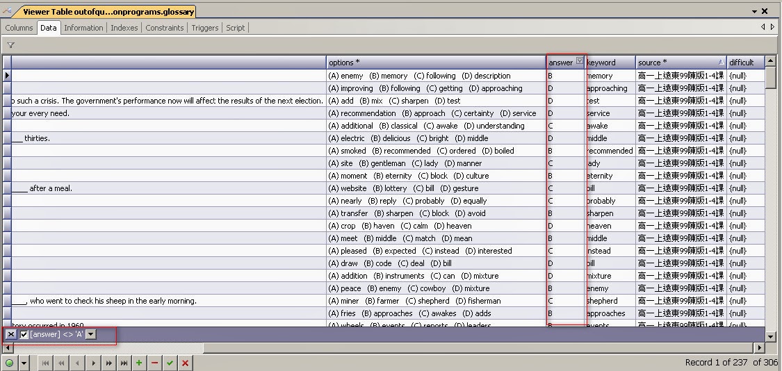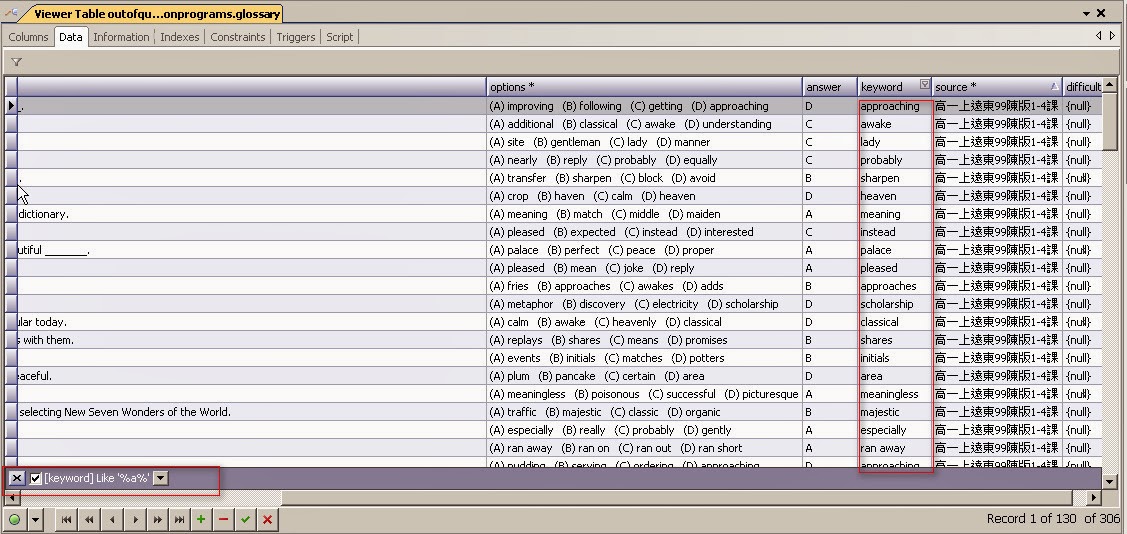 一、在表格清單 你要查詢的欄位, 滑鼠移到欄位上方,出現小框(如圖紅框)二、點選小框,出現選擇框,選擇Custom三、出現Custom條件框,選擇條件 為equals (是等於的意思) 四、輸入你要等於什麼值,這裡是 輸入:A 五、查詢結果 :就可以查出 答案是A的資料了。 六、其它常用條件 does not equal 不等於結果 使用 like (相似比對使用%) : like用法詳如:[MySQL]2-2 使用LIKE 查詢資料用法 輸入條件加入% 結果 其它文章 首頁JAVA 目錄JAVA WEB 目錄JAVA 其他未分類 目錄Grails目錄jQuery 目錄Apache 目錄JavaScript 目錄Spring + Hibernate 目錄Hibernate 目錄Linux 目錄程式開發工具目錄MySQL 目錄PHP目錄C/C++ 目錄Google App Engine 目錄HTML5/CSS3程式開發基本資訊Android Oracle 目錄Struts 目錄