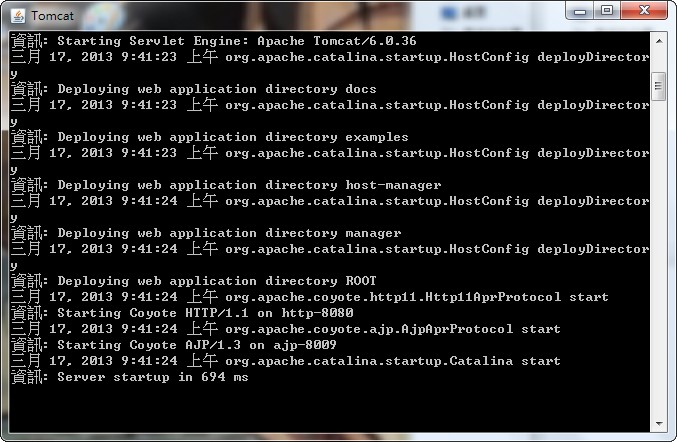 四、啟動Tomcat服務 通常設定到這裡就可以正常啟動Tomcat, 在apache-tomcat-6.0.36\bin裡的 startup.bat滑鼠按兩下