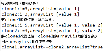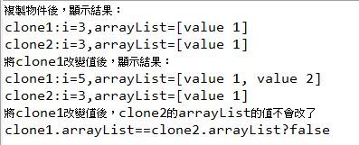 System.out.println("將clone1改變值後,clone2的arrayList的值也會改");