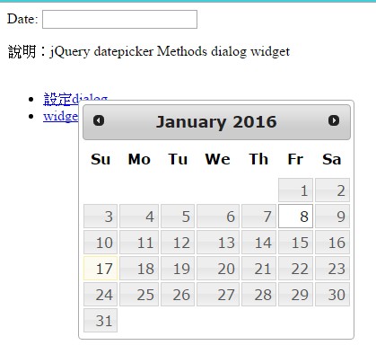 本文說明datepicker Methods 中的dialog widget